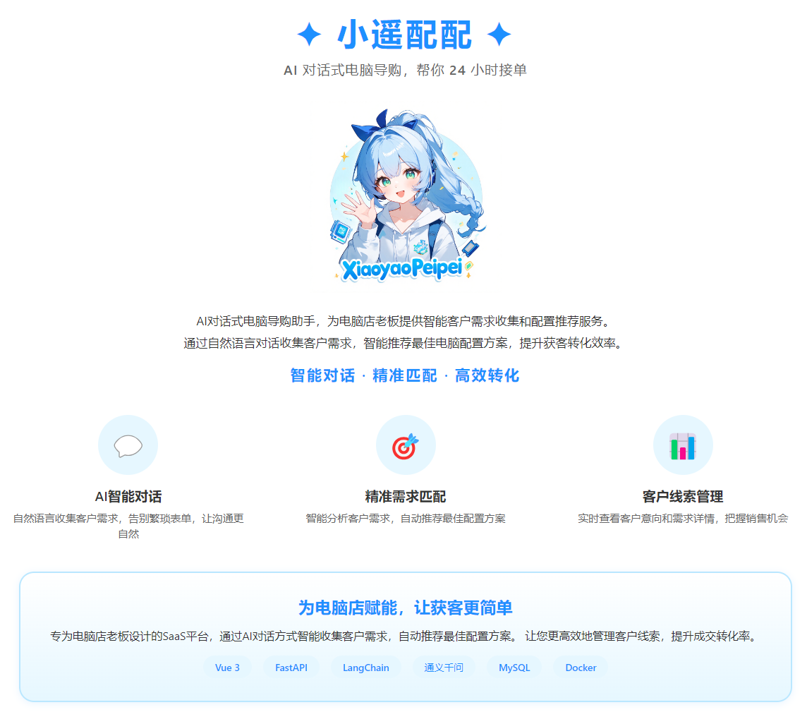 小遥配配是一款专为电脑店老板设计的AI导购助手,通过自然语言对话自动识别客户需求,智能推荐最佳电脑配置方案,帮助商家提升服务效率和客户满意度。